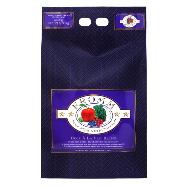 Fromm Four-Star Duck A La Veg recipe for dogs is a specially prepared entrée with duck, sweet potatoes, and an assortment of fruits & vegetables. Fromm Four-Star provides a variety driven gourmet dining experience for your dog.